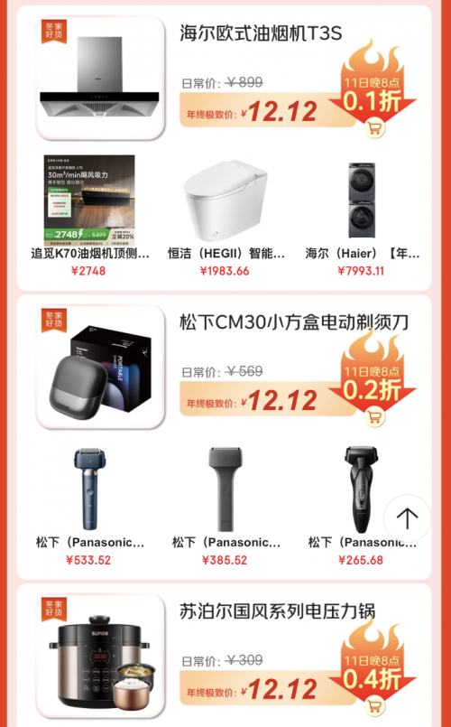 厨房方寸之间,却承载着生涯的人烟气与家的眷注。海尔欧式油烟机T3S凭借420Pa超大风压和20m³/min大吸力,能在爆炒陡然飞速吸净油烟;苏泊尔国风系列电压力锅通过双胆确立霸道炖煮煲汤等多种需求,锁住养分与原香,以上两款好物在12月11日晚8点惟有12.12元。苏泊尔一机四用智能炒菜机器东说念主,号称厨房外行的“私东说念主厨师”;好意思菱风冷一级三门雪柜则以其大容量、缜密分储和长效保鲜技能,成为家庭食材健康的“看守站”,这两款好物在12月11日晚8点,将以1212元的惊爆价进行限量抢购。