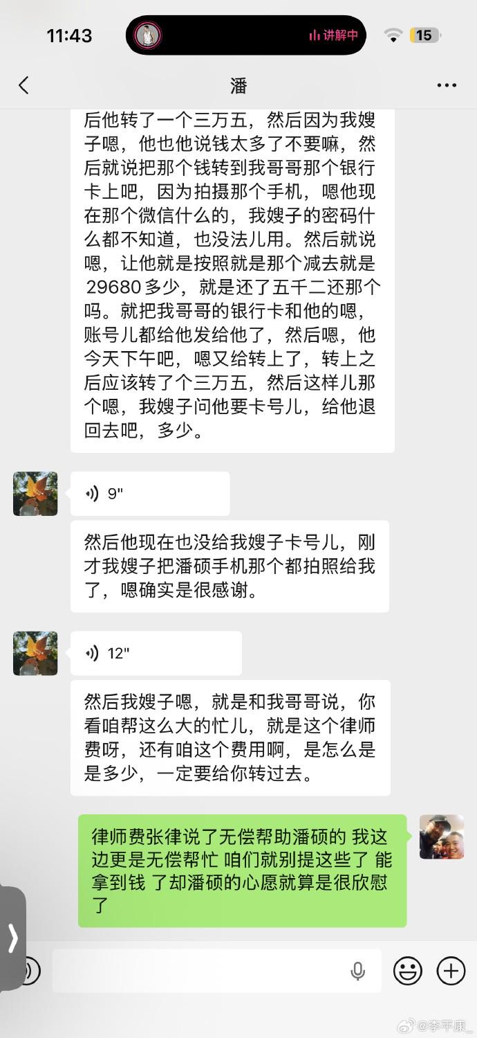 潘硕家东说念主发来信息,戴琳已把欠款至当天还清,而况还有多给5000多,潘姆妈不肯多收,暗意思要送还,不外戴琳也莫得搭理如故转了35000,这小数如故要客不雅的通报给内行的,敬佩潘硕在天之灵也会喜跃的… 潘硕家东说念主也奉求我在微博上向所相脸色他们的球迷一又友抒发感谢!这件事总算了结,也但愿潘硕不错安息!